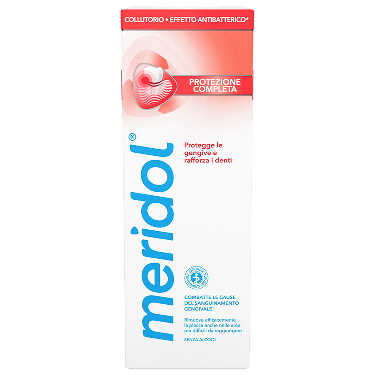 Proteggi le gengive e rafforza i tuoi denti con il collutorio meridol Protezione completa. Questo collutorio per le gengive è stato sapientemente creato per combattere la causa principale* del sanguinamento delle gengive e dell'infiammazione. Il collutorio protegge inoltre le gengive e rafforza i denti, mentre la sua efficace formula a doppia azione fornisce una protezione antibatterica di lunga durata*. Protegge dalla carie, garantisce un alito fresco e rafforza lo smalto.